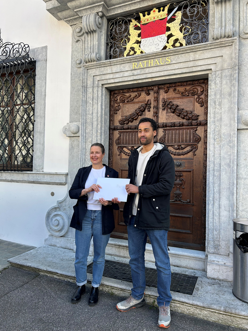 Übergabe der Petition durch Justin Browne an Kantonsratspräsidentin Myriam Frey Schär