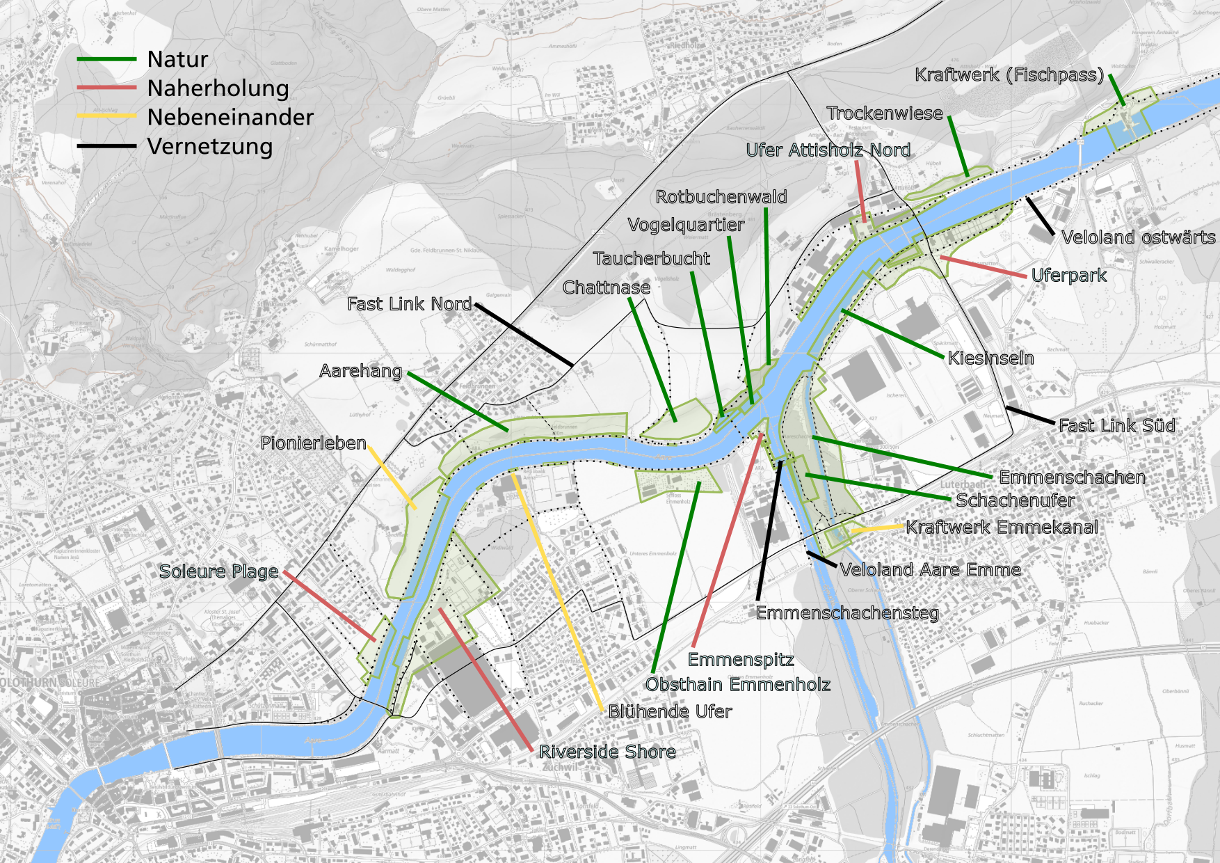 Die örtlichen Eingriffe sind punktuell und tendenziell minimal. Sie orientieren sich an den vier Nutzungstypen Natur, Naherholung, Nebeneinander und Vernetzung. Fokusräume für Naherholung sind stadtnah angesiedelt (Solothurn, Zuchwil). Flussabwärts nimmt die Naherholungsnutzung progressiv ab, bis sie im Bereich der Emmemündung komplett dem Naturraum weicht. Zum Attisholz hin erfolgt ein Szenenwechsel zurück zur Naherholung.