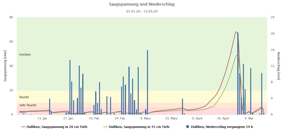 Schaut man sich den Waldstandort Dulliken an, fällt auf, dass der Oberboden (in 20 cm Tiefe) und der Unterboden (in 35 cm Tiefe) noch bis Mitte April feucht bis sehr feucht waren - zu einem Zeitpunkt also, als die Waldbrandgefahr bereits gross war. Als Mass für den Wassergehalt eines Bodens gilt die Saugspannung: je höher die Saugspannung desto trockener der Boden. Erst gegen Ende April nahm die Saugspannung stark zu die Böden trockneten zunehmend aus. Auf die Waldbrandgefahr hat die Bodenfeuchtigkeit jedoch kaum einen Einfluss, da Waldbrände hauptsächlich durch das Entzünden der Streuschicht (abgefallene Blätter, Totholz oder Gestrüpp) entstehen. Ist zusätzlich die Humusschicht (oberste 5-10 cm) sehr trocken, besteht die Gefahr grossflächiger Waldbrände.