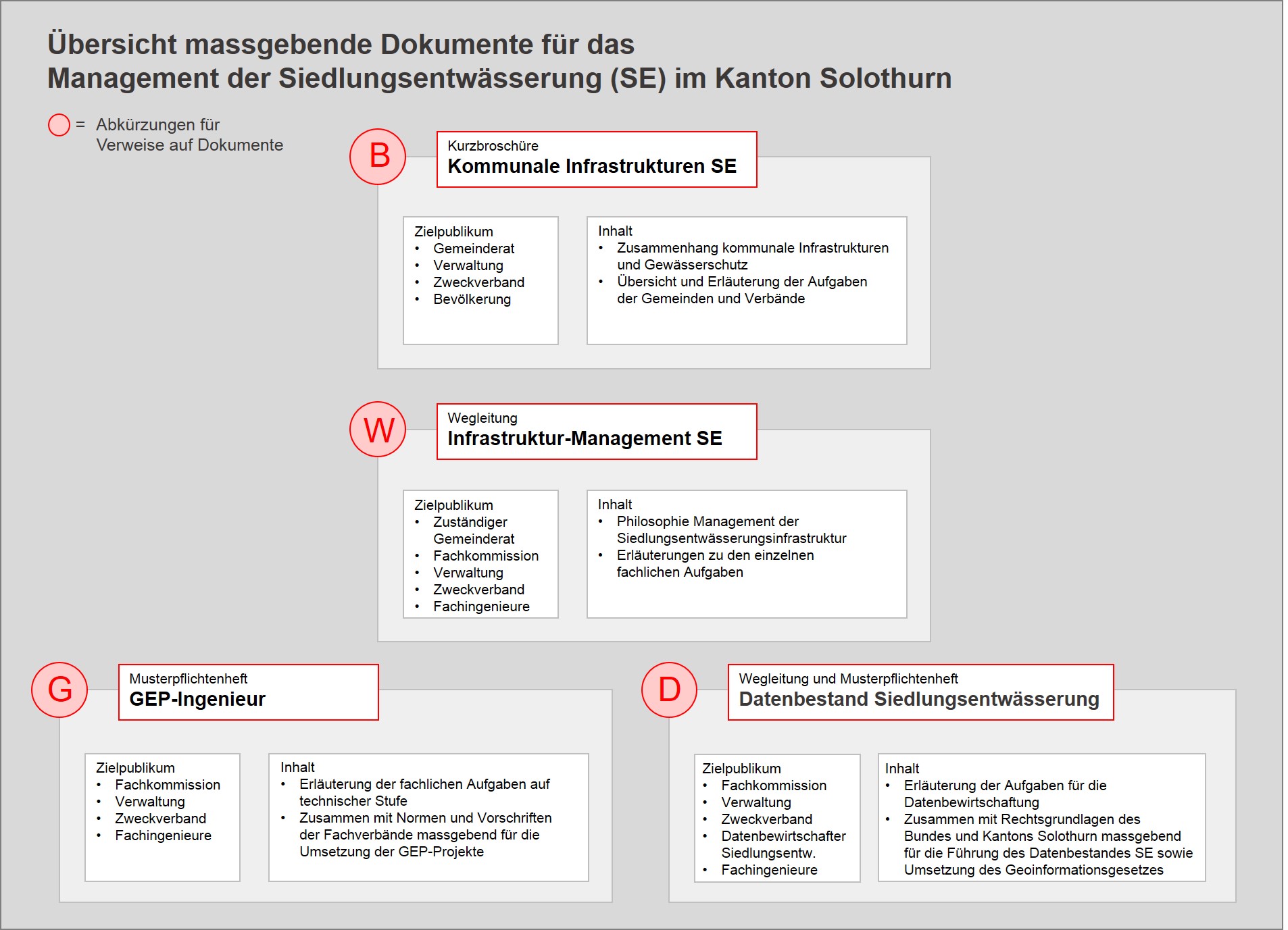 Für den Betrieb und Werterhalt der kapitalintensiven Anlagen ist eine langfristige Planung wichtig. Mit der Generellen Entwässerungsplanung (GEP) werden die strategische Planung angegangen, die nötigen Massnahmen definiert und deren Umsetzung zeitlich festgelegt. Für diese Arbeiten stellt das Amt für Umwelt den Verantwortlichen verschiedene Hilfsmittel und Informationen zur Verfügung.