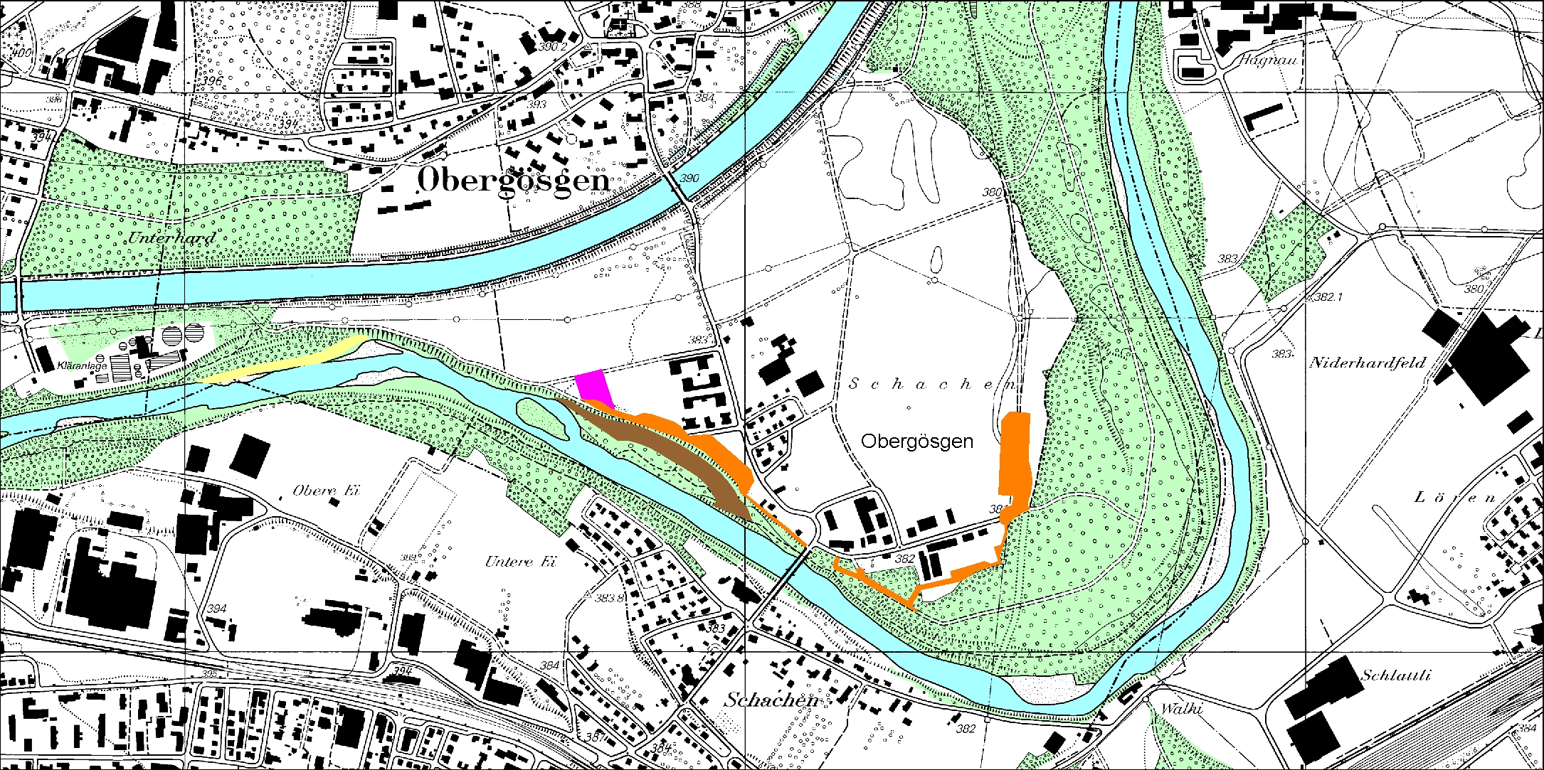 Die Umsetzung des Hochwasserschutz- und Revitalisierungsprojektes an der Aare im Niederamt geht in die letzte Etappe. Mitte August 2017 beginnen die Arbeiten am Baulos 4, welches ein Seitengerinne in Niedergösgen (Gebiet Aarmätteli / Oberschachen), eine Hochwasserschutzmauer in Schönenwerd (Ballyareal) und den Rückbau der sogenannten Ballyschwelle beinhaltet. Der Abschluss dieser letzten Etappe des Aareprojektes ist Ende 2018 geplant.