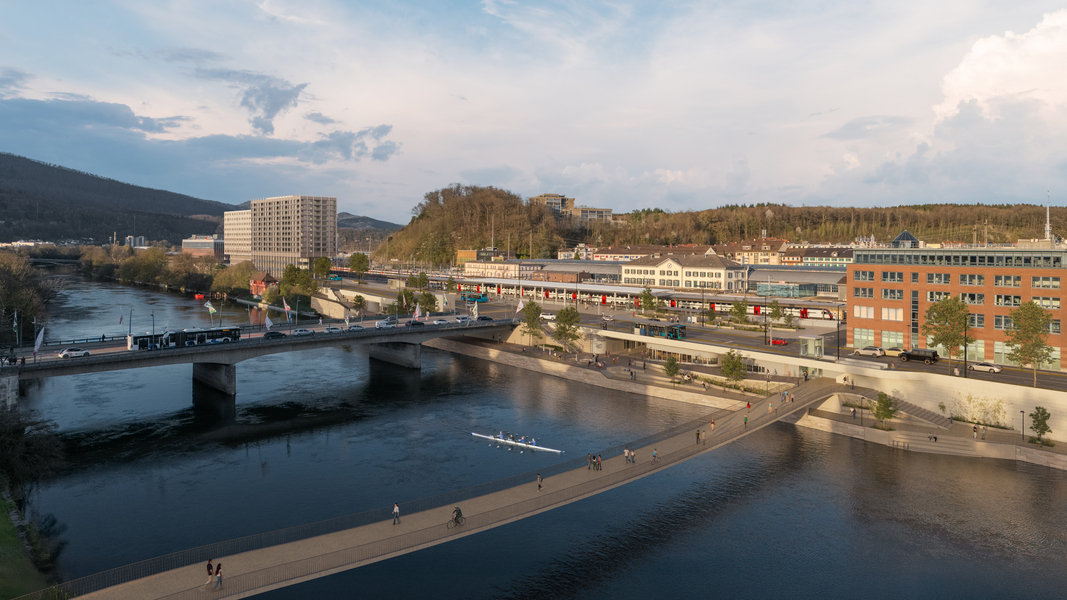 Zwei grosse Velostationen ermöglichen einen direkten Zugang zum BHF. Die Bushaltestellen entlang der Kantonsstrasse sind gut erreichbar. Im Süden des Bahnhofs entstehen eine «Kiss & Ride»-Zone sowie Taxistandorte. Neue Verbindungen (Passagen, Rampen und der Aaresteg) erleichtern das Umsteigen. Die unterirdischen Bereiche, die Passagen, die Zugänge und das Parkhaus ergänzen die oberirdischen Flächen ideal. So werden auch die Verbindungen zwischen Altstadt, Fluss und Bahnhof gestärkt.