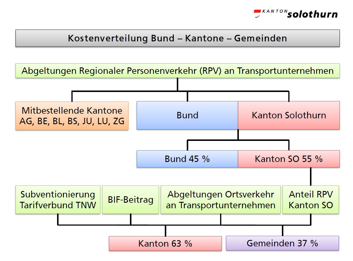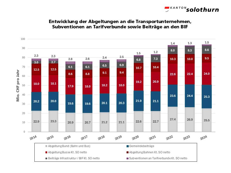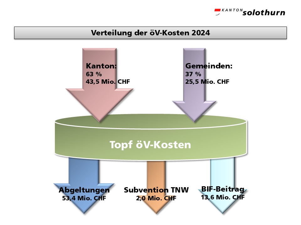 Die Kosten für den öffentlichen Verkehr (öV) betragen im Kanton Solothurn rund 94 Mio. CHF, welche gemeinsam vom Bund, dem Kanton und den Gemeinden getragen werden. Nach Abzug der Bundes- und Gemeindeanteile verbleibt dem Kanton ein Betrag von 43,5 Mio. CHF (Stand 2024).