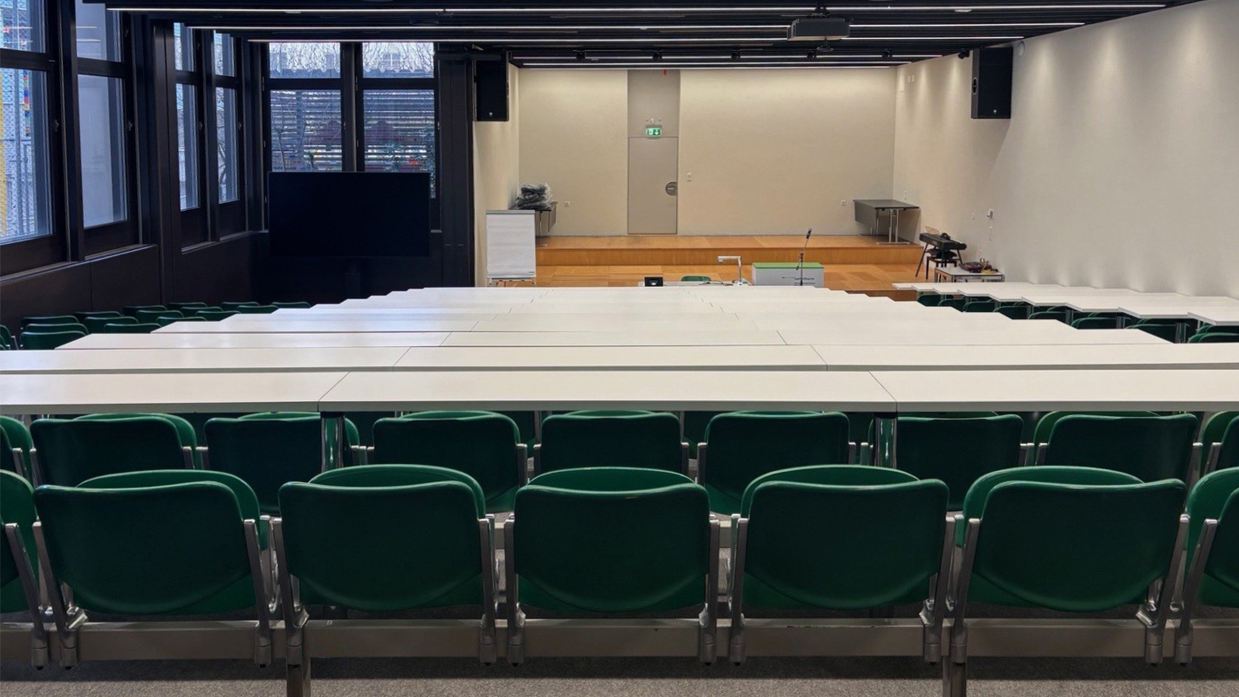Die Aula aus den 1980er-Jahren wurde umfassend innen saniert und modernisiert. Sie erfüllt nun die Anforderungen an eine zeitgemässe Aula für Unterricht, Tagungen und kulturelle Veranstaltungen. Raumgestaltung, Akustik, Beleuchtung, WLAN und Infrastruktur wurden vollständig erneuert und auf den aktuellen Stand gebracht.
