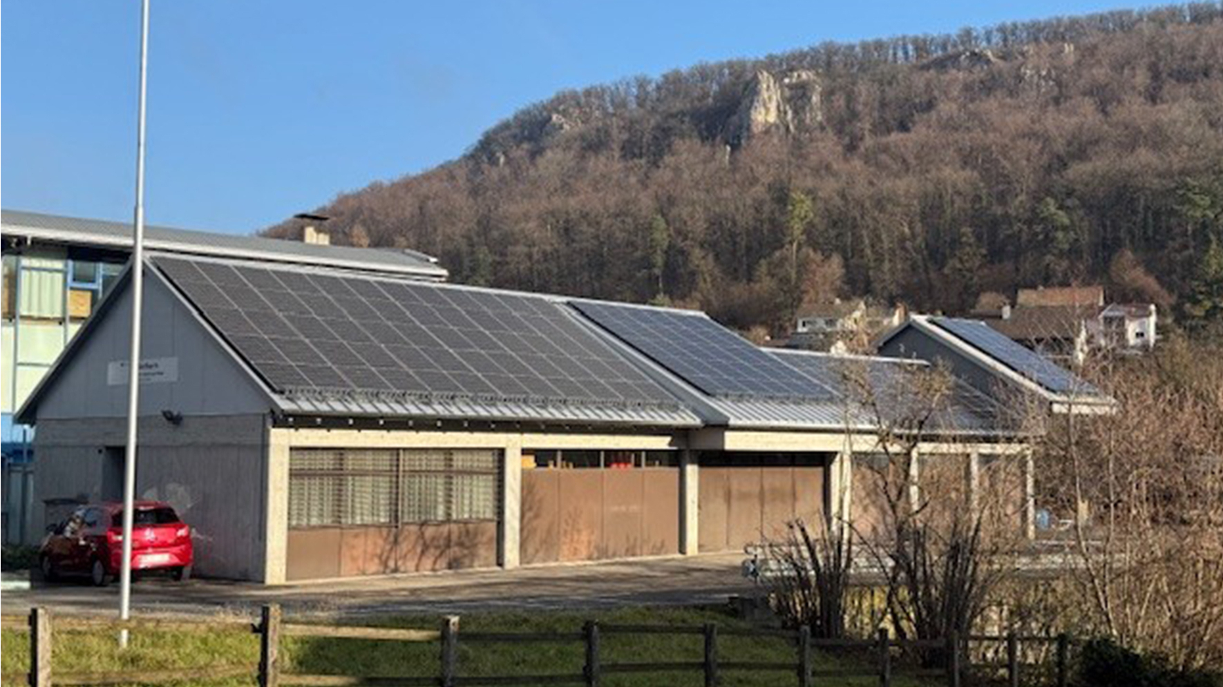 Die Dacheindeckung mit asbesthaltigen Faserzementplatten aus dem Jahre 1985 war stark abgenutzt und Reparaturen waren vermehrt notwendig. Die Elektro-Unterverteiler wiesen alte Schraubsicherungen und fehlende Fehlerstromschutzschalter auf und waren störungsanfällig. Die Dachflächen wurden für die Installation von PV-Anlagen vorbereitet und die Elektro-Haupt- sowie die Unterverteiler ersetzt. Zudem wurde die gesamte FL-Beleuchtung mit neuen LED-Leuchten ersetzt.