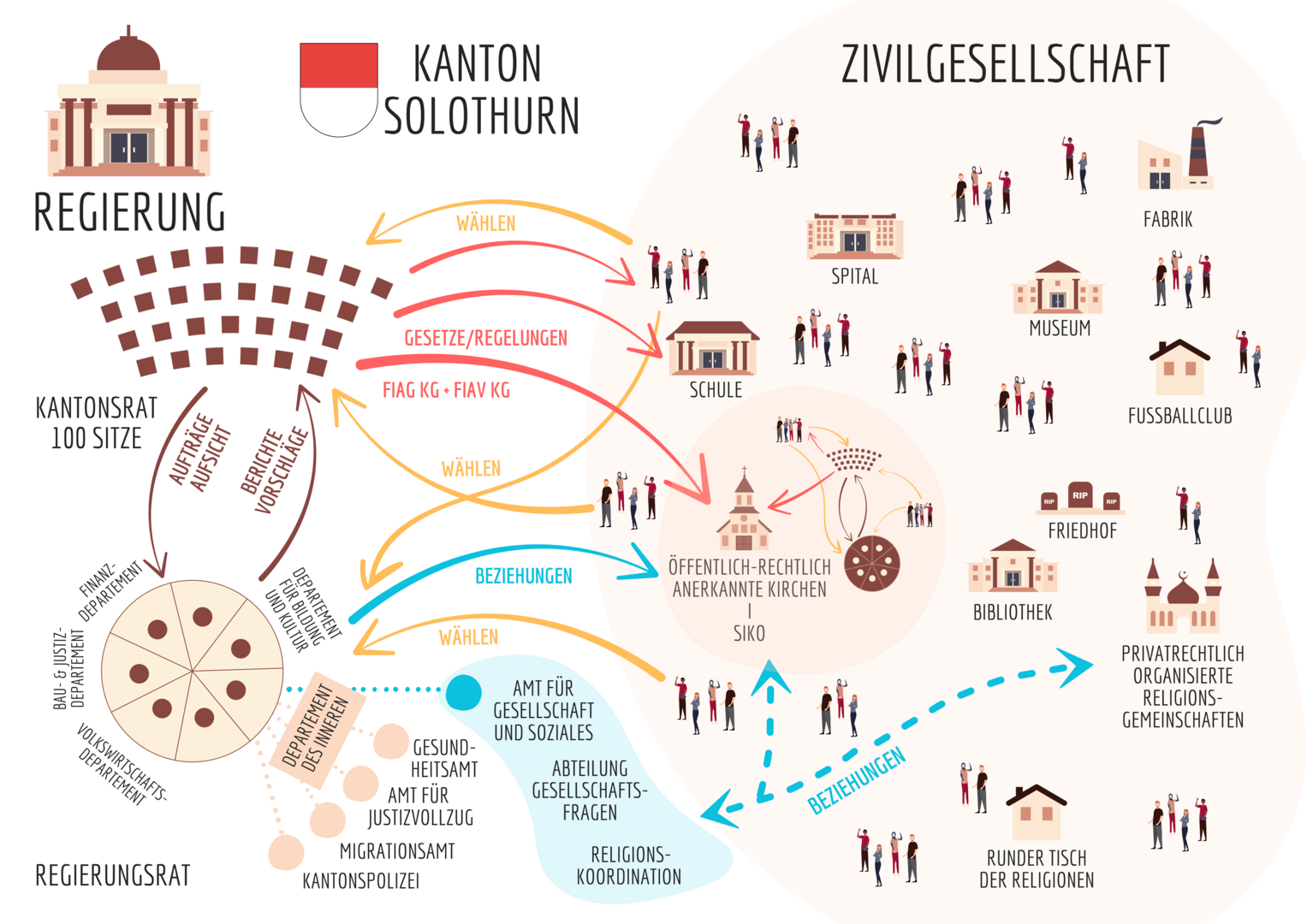 Für die Regelung des Verhältnisses zu den einzelnen Religionsgemeinschaften sind die Kantone zuständig. In verschiedenen Themenbereichen gibt es gemeinsame öffentliche Interessen und Aufgaben. Die Koordinationsstelle Religionsfragen verknüpft die Anliegen von privatrechtlich organisierten Religionsgemeinschaften mit denjenigen von Verwaltung, Politik und der Gesamtgesellschaft. Die Koordinationsstelle Religionsfragen