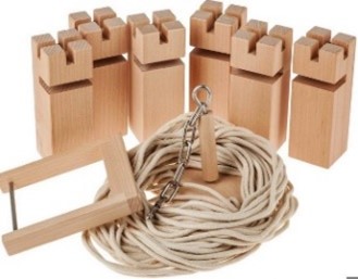 Fördert Teamwork, Geduld und Feinmotorik. Ziel: 6 Holzteile mit Seilen aufeinandersetzen, ohne den Turm zum Einsturz zu bringen.