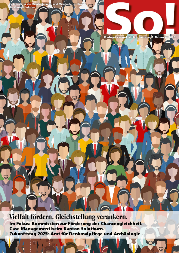 Die SO! Personalzeitschrift ist eine interne Publikation des Kantons Solothurn, speziell für die Mitarbeitenden. Sie erscheint viermal jährlich und ist fester Bestandteil der Internen Kommunikation. Jede Ausgabe beinhaltet tiefe Einblicke in Neuigkeiten und Entwicklungen, Porträts von Mitarbeitenden, Erfolgsgeschichten sowie Themen aus den verschiedenen Fachbereichen.