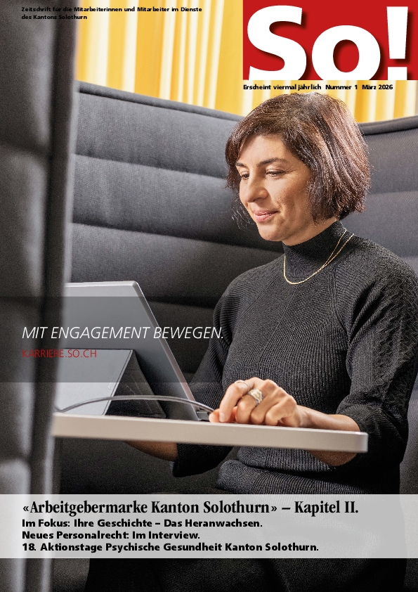 Die SO! Personalzeitschrift ist eine interne Publikation des Kantons Solothurn, speziell für die Mitarbeitenden. Sie erscheint viermal jährlich und ist fester Bestandteil der Internen Kommunikation. Jede Ausgabe beinhaltet tiefe Einblicke in Neuigkeiten und Entwicklungen, Porträts von Mitarbeitenden, Erfolgsgeschichten sowie Themen aus den verschiedenen Fachbereichen.