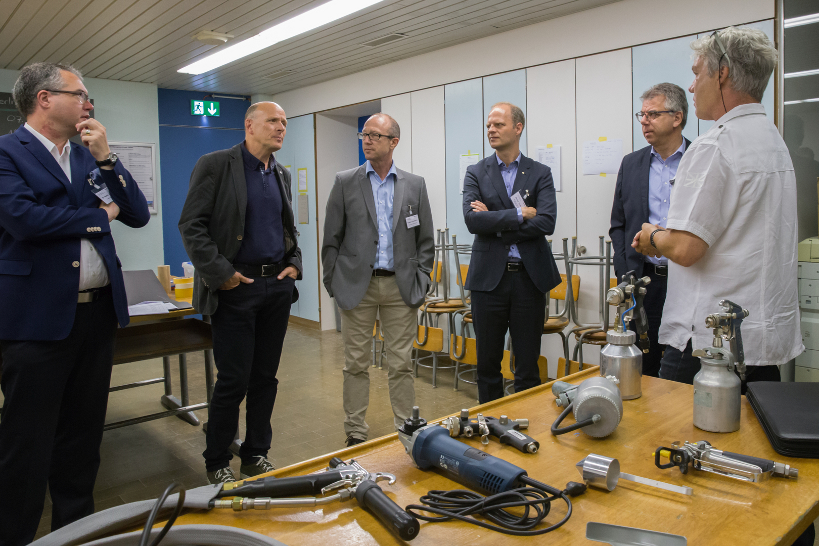 Begrüssung zum Prüfungsbesuch im BBZ Olten. v.l.: Landammann Remo Ankli, Thomas Jenni, Ruedi Zimmerli, Daniel Probst, Andreas Gasche und Chefexperte Martin Lisibach.