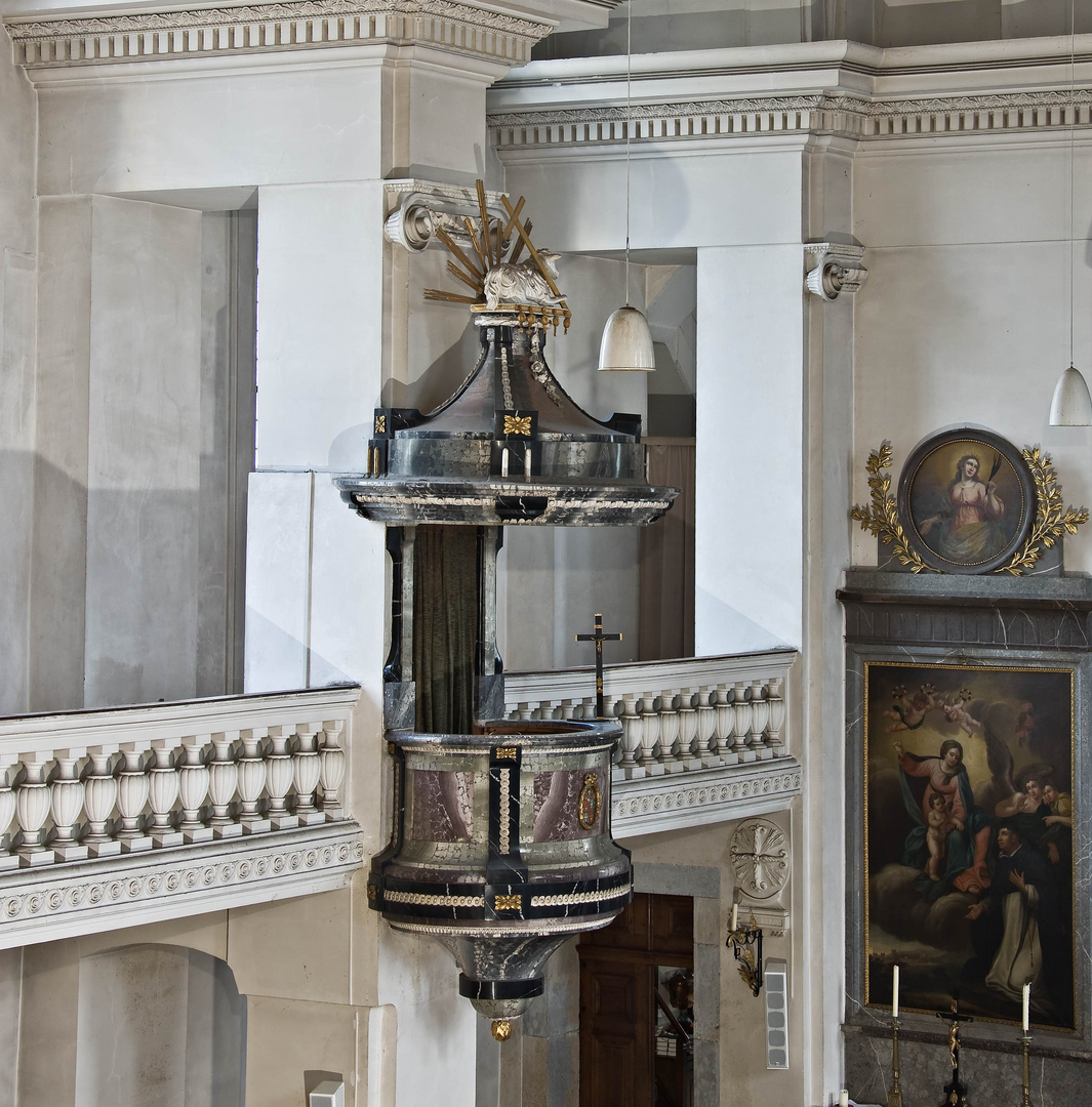 - Die Stadtkirche Olten wird bis 2018 umfassend restauriert. Die klassizistische Kanzel setzt im weiss getünchten Innenraum einen farblichen Akzent. Bildnachweis: Kantonale Denkmalpflege Solothurn (1 MB, jpg)