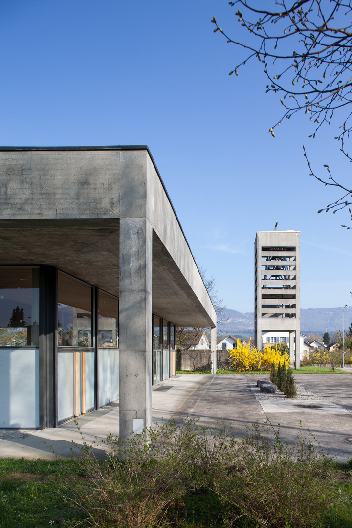 - Beton und Glas prägen die streng reduzierte Architektur der 1965/66 errichteten reformierten Pfarrkirche in Luterbach. Bildnachweis: Börje Müller, Basel (1 MB, jpg)
