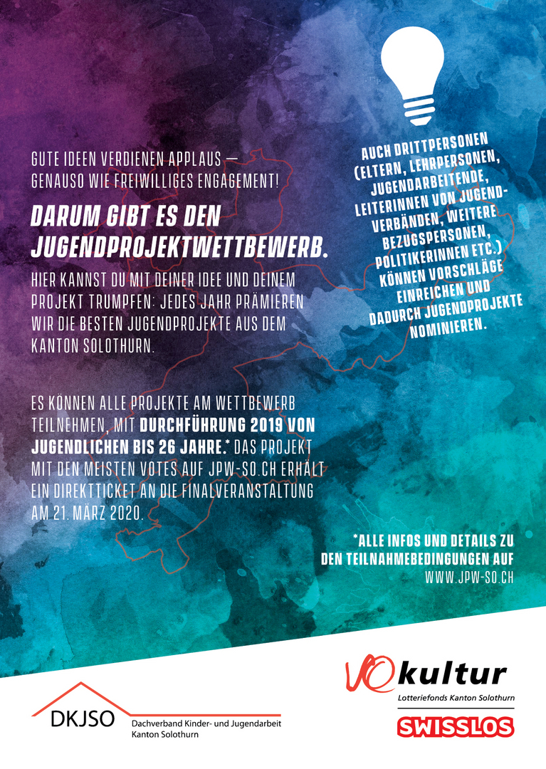 Es ist wieder soweit: Gute Ideen verdienen Applaus – genauso wie freiwilliges Engagement! Darum gibt es den Jugendprojektwettbewerb. Die besten Jugendprojekte aus dem Kanton Solothurn werden auch dieses Jahr wieder mit insgesamt 15‘000 Franken prämiert. Neben Jugendlichen bis 26 Jahre können auch Drittpersonen Vorschläge einreichen und Jugendprojekte nominieren. Die Eingabe- und Nominationsfrist für den Jugendprojektwettbewerb 2019 läuft.