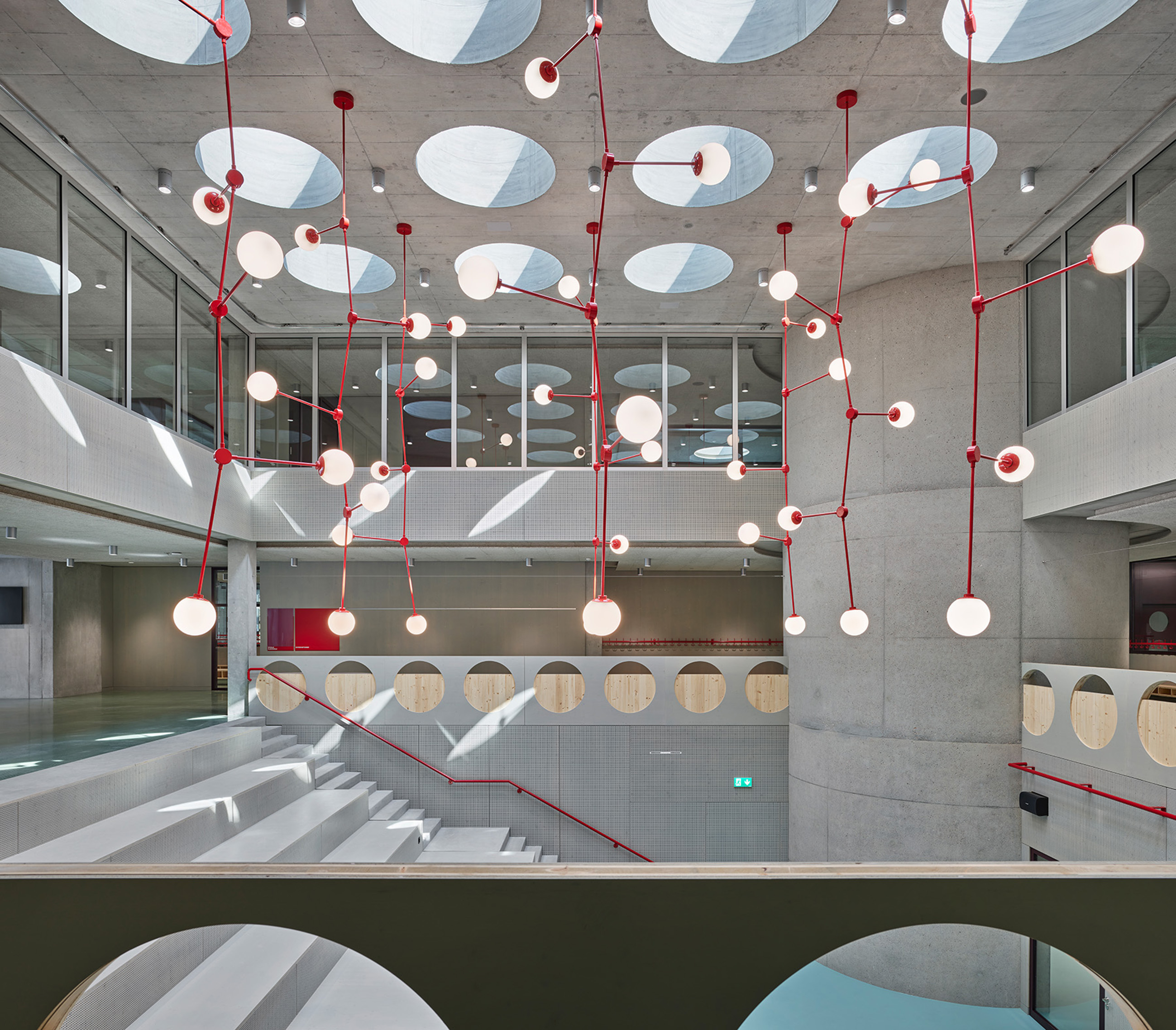 Der Neubau steht selbstbewusst an der Arealgrenze, in Rücksicht auf den natürlichen und sozialen Umraum: Durchlässig in seiner äusseren Erscheinung, wartet das Haus im Inneren mit überraschenden Perspektiven auf. Das ortspezifische Bild der Turbine streckt seine Schaufeln vom inneren Kern bis zur Materialisierung der Fassade. Ein dynamisches Prinzip, das doch Ruhe bewahrt – mit Gewinn für alle.