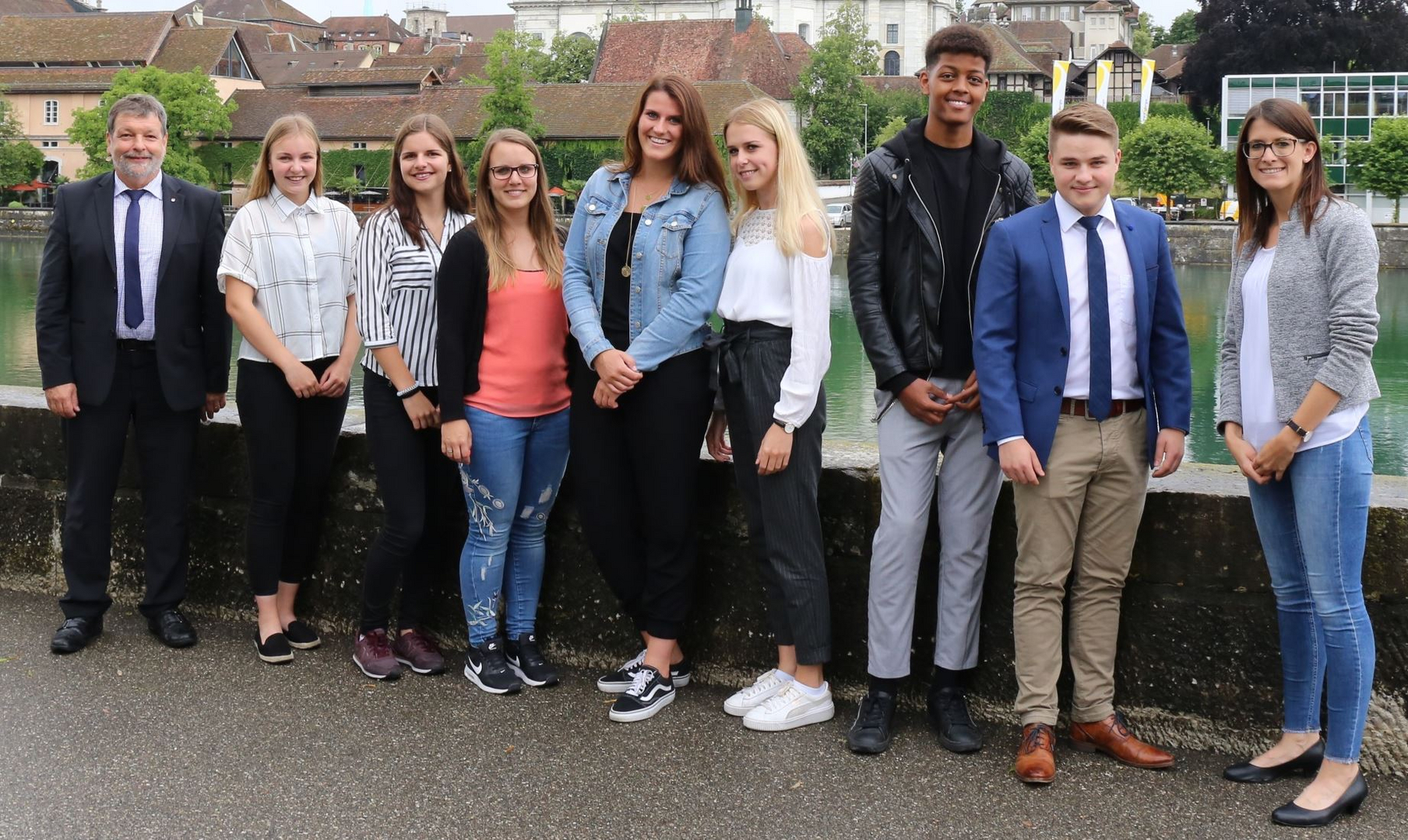 Bildlegende (v.l.n.r.): Landammann Roland Heim, Andrea Erni Berufsbildungszentrum Olten), Lena Stuber (Amtschreiberei Region Solothurn), Jessica Dubach (Berufsbildungszentrum Solothurn-Grenchen), Claudia Kofmel (Departementssekretariat, Volkswirtschaftsdepartement), Michelle Schneider (Amt für soziale Sicherheit), Dagmawi Kana (Amt für soziale Sicherheit), Marius Winistörfer (Amtschreiberei Thal-Gäu), Sabrina Ryser (Koordinatorin Berufliche Grundbildung, Personalamt)