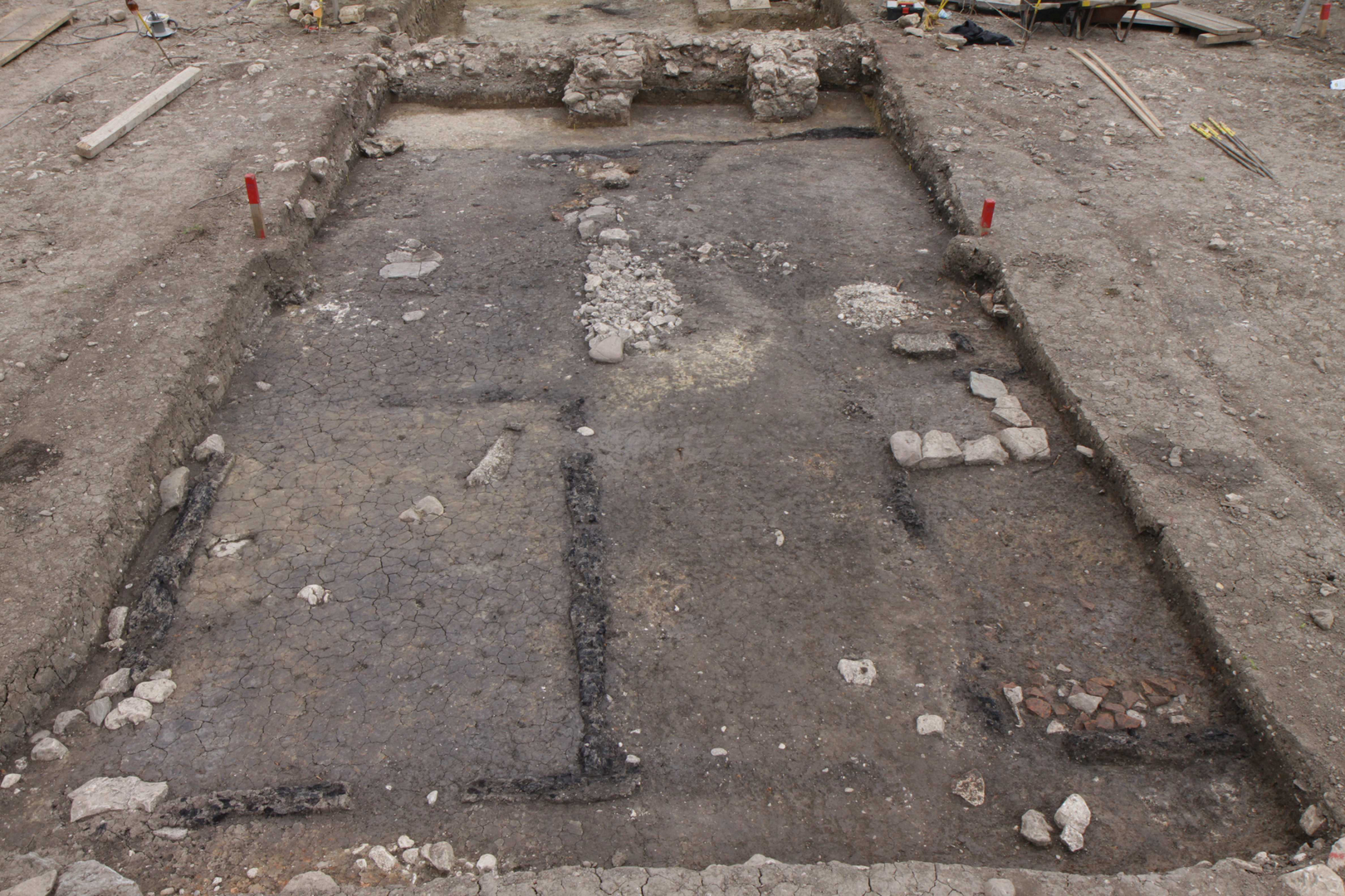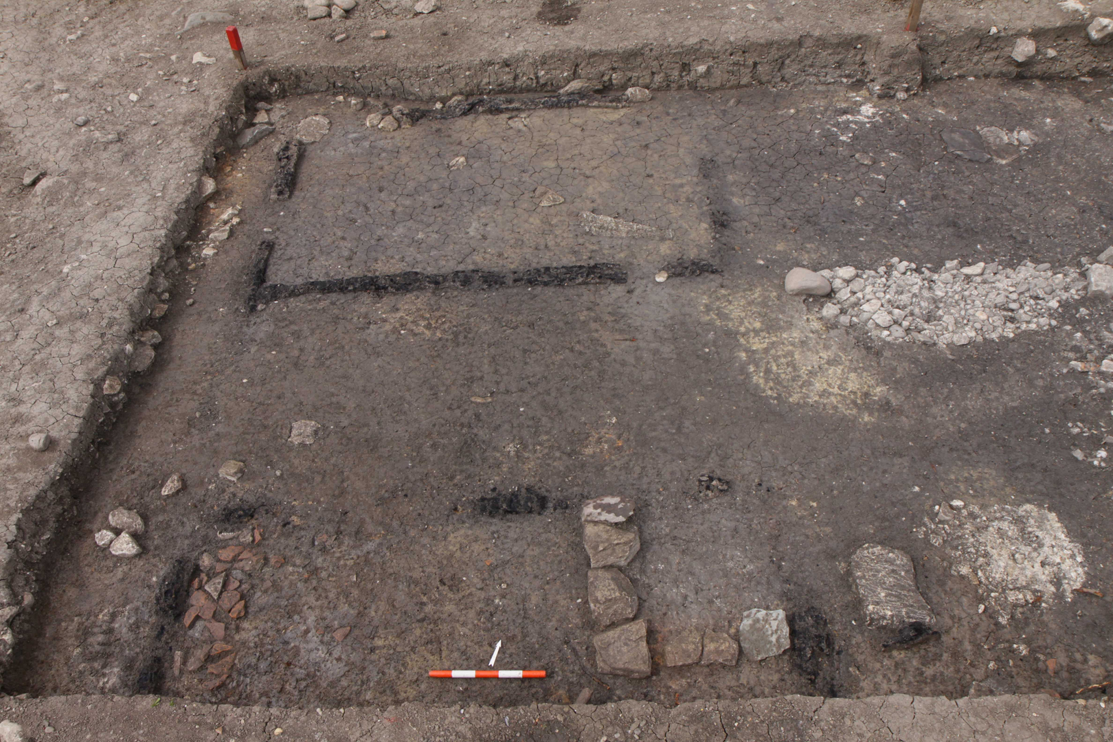 5. Balkenreste der in Holz ausgeführten Kammern im gassenseitigen Hausdrittel. Im Vordergrund rechtwinklige Steinsetzung des Ofenfundamentes der Stube.
