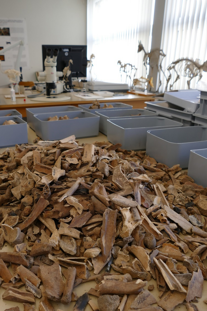 9. Die 2442 Tierknochen wurden auf einem Tisch ausgelegt und nach Skelettteil und Tierart sortiert. Sie geben Auskunft über die Essgewohnheiten der mittelalterlichen Stadtbewohner.