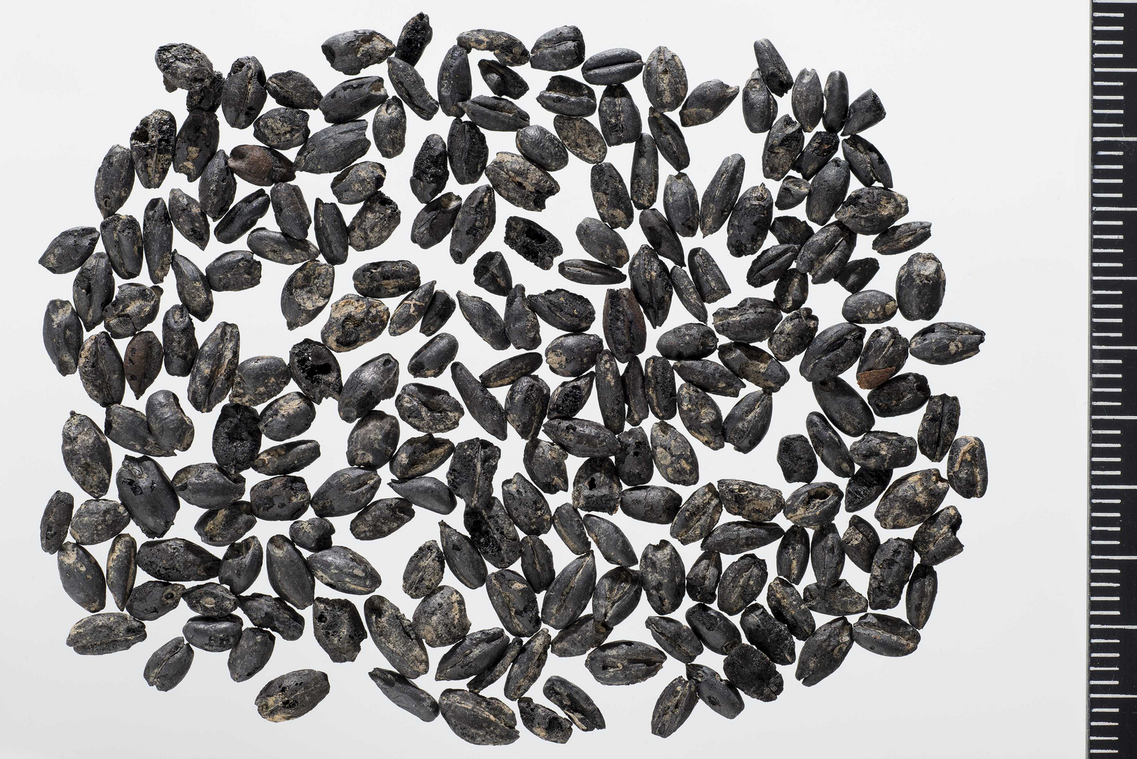 2. Verkohlte Getreidekörner aus dem Brandschutt eines ehemaligen Herrenhofes der Grafen von Neuenburg vor der Gründung der Stadt.