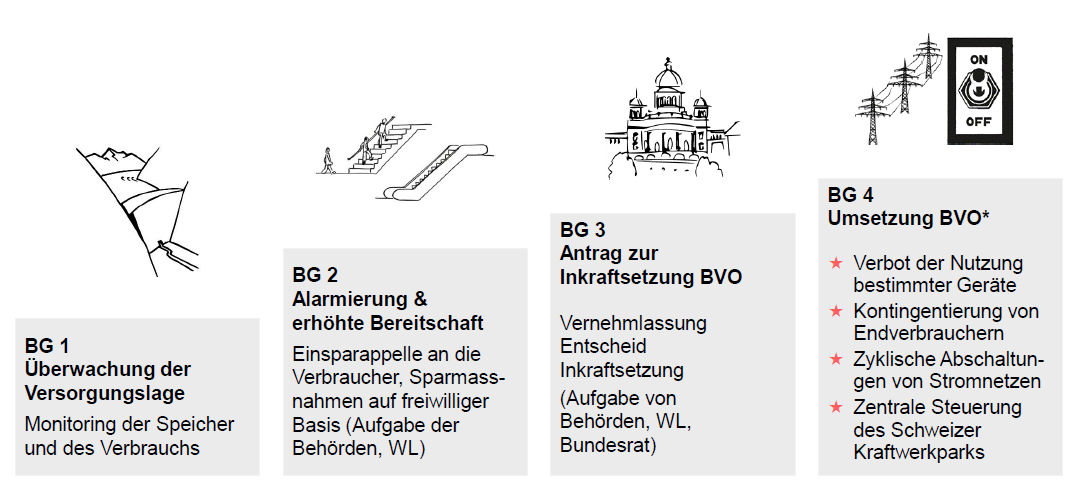 Auf der untenstehenden Abbildung sind die vier Bereitschaftsgrade aufgeführt (Quelle: VSE).